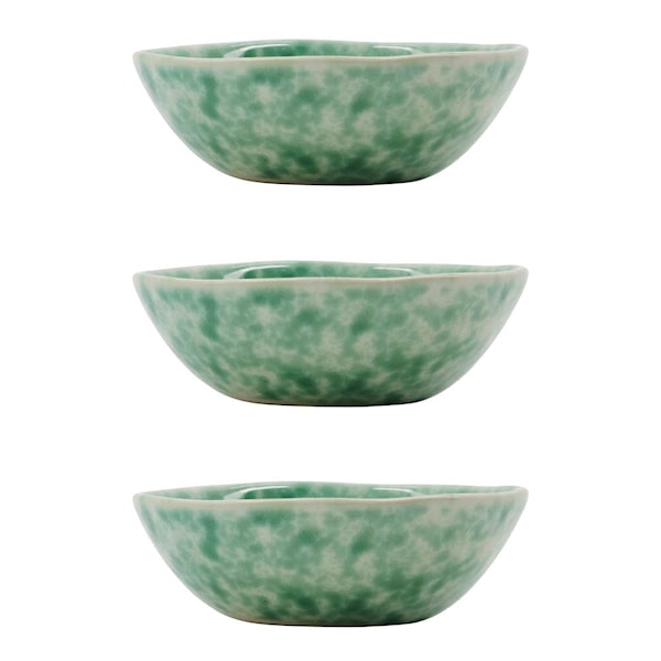 Diva miniskålar från House Doctor (4 cl) i grönt är ett charmigt set om tre som ger dukningen ett fräscht lyft. Varje skål har handmålad splash-dekor i grönt på en offwhite bas, och den oregelbundna formen bidrar till den unika känslan.