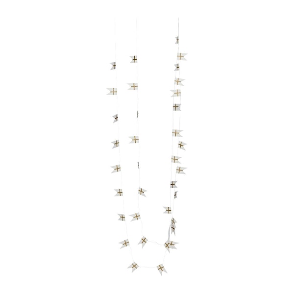 House Doctor Flags girlang 500 cm vit/champagne är en dekorativ girlang med små flaggor i papper. Den ljusa kombinationen av vitt och champagnefärgat papper kompletteras av detaljer i guldglitter.