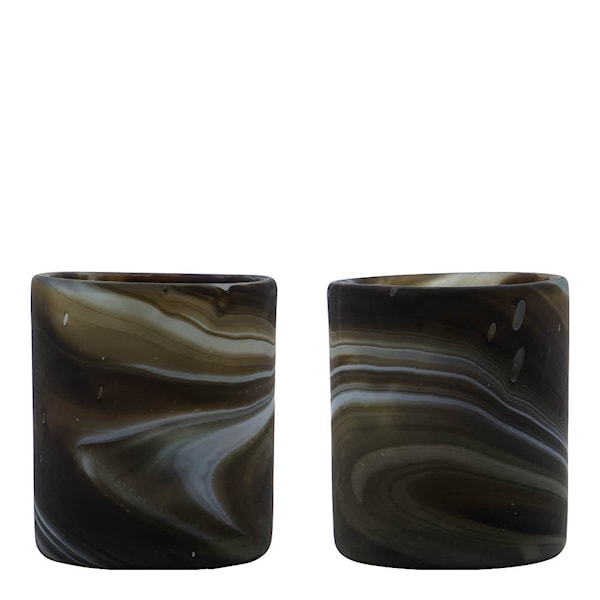 Skapa en inbjudande atmosfär med Kae ljuslyktor från House Doctor (8x7 cm). Setet innehåller två munblåsta värmeljushållare i brunt glas med marmorerat mönster – perfekt för att sprida värme och elegans i hemmet.