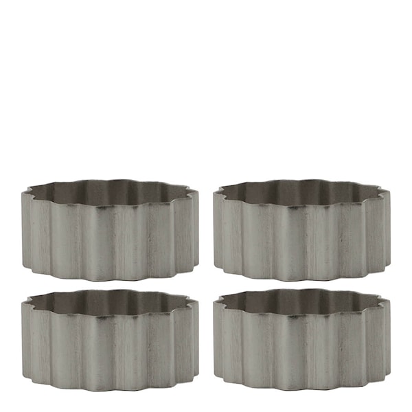Servettringar i metall med silverfinish. De har en solid, rund form och en mjukt vågig kant. De rena linjerna skapar struktur och ger en dekorativ touch till julens dukningar. Setet innehåller fyra servettringar.
