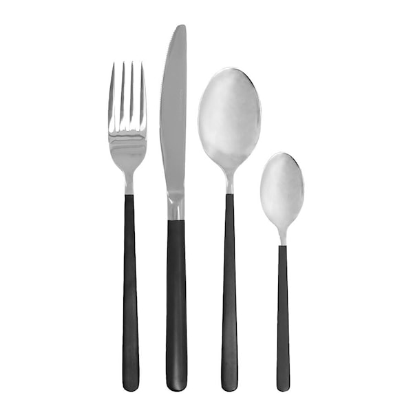 Ox bestickset (16 delar) från House Doctor i svart och stål skapar ett sofistikerat uttryck vid varje måltid. Den tåliga ytan i rostfritt stål med titanbeläggning ger både funktionalitet och stil. Besticksetet innehåller fyra knivar, fyra gafflar, fyra matskedar och fyra teskedar.