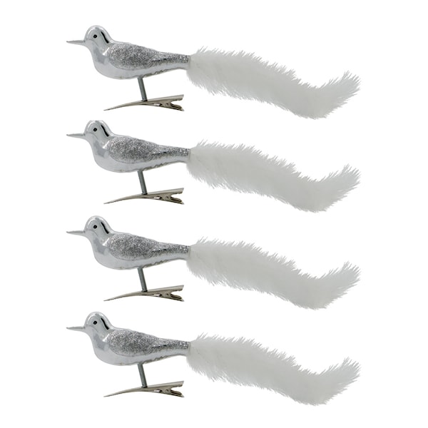 Den här förpackningen med 4 fågelprydnader med klämmor har en klassisk silvernyans med glittervingar som reflekterar det varma skenet från julgranslju