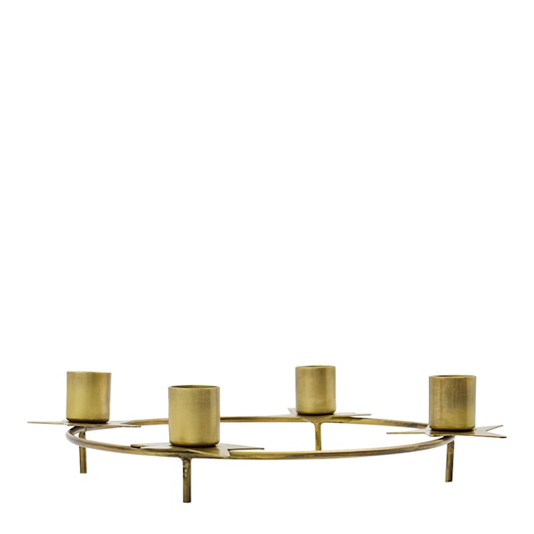 Stage från House Doctor är en rund adventsljusstake med unik karaktär – handgjord i järn och försedd med en varm antik mässingsfinish som ger hemmet ett gyllene sken under vinterhalvåret. De fyra hållarna för kronljus pryds av dekorativa stjärnor med fem uddar, vilket ger ett subtilt juluttryck utan att kännas överdrivet. Med sin runda form blir den ett naturligt blickfång på matbordet, sideboardet eller fönsterbrädan.