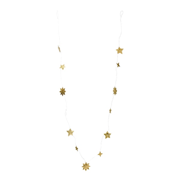 House Doctor Stars girlang 200 cm i antik mässing är en dekorativ girlang med sammanflätade stjärnor i metall. Den antika mässingsytan framhäver formen och ger ett varmt metalliskt uttryck.