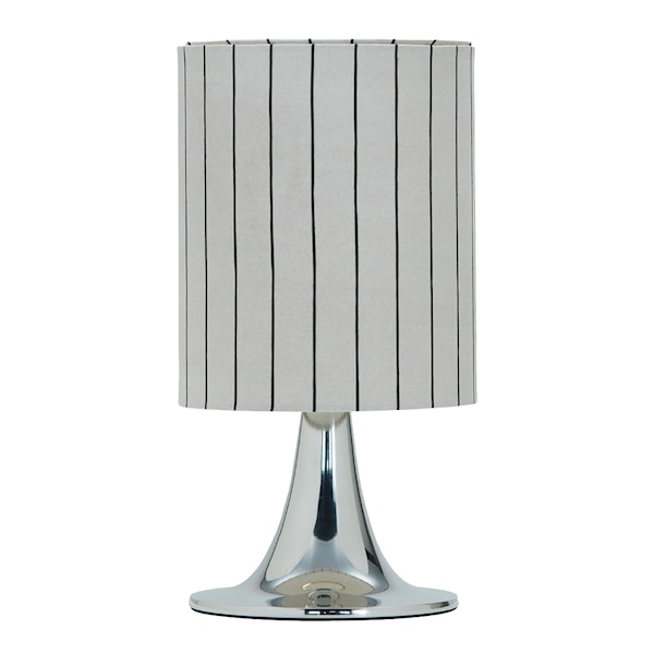 Den har en smal aluminiumbas med silverfinish och tulpanform