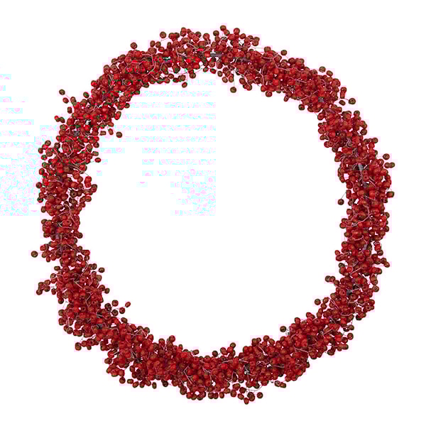 House Doctor Winter krans 33 cm röd är en handgjord krans inspirerad av vinterbär. Den består av röda träpärlor som träs på metalltråd och fästs runt en metallram som ger stabil form.