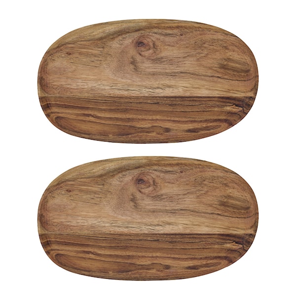 Wood serveringsbrickor på 33x19 cm från House Doctor är ett set med två serveringsfat som kombinerar funktion och form med ett naturligt uttryck. Den ovala formen och de rundade kanterna ger brickorna ett sofistikerat intryck, medan den släta ytan framhäver de unika ådringarna i träet.