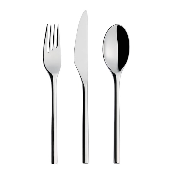 Besticket har ett stilrent skandinaviskt formspråk och karakteriseras av sina runda skaft och diagonala linjer. Besticken är tillverkade av högkvalitativt, rostfritt stål och passar lika bra till vardagens måltider som till fina middagar.