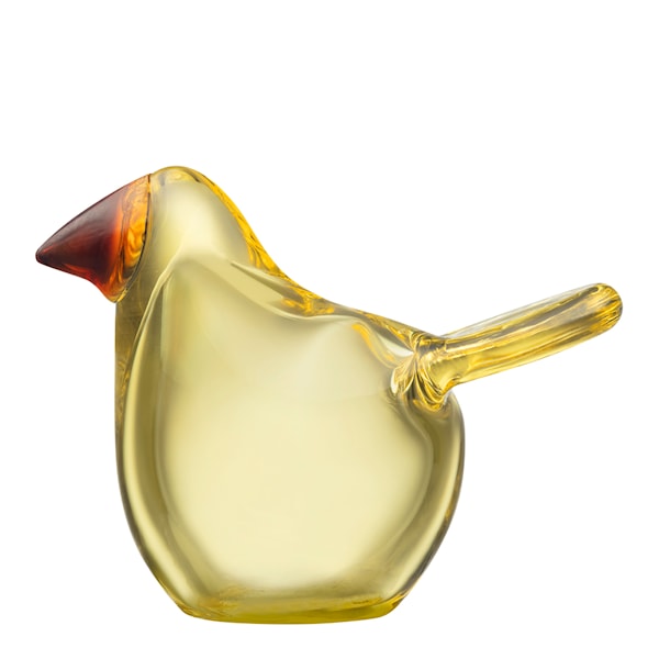 Varje fågel är munblåst av skickliga glasblåsare vid Iittalas glasbruk i Finland, vilket gör varje exemplar helt unikt – ingen fågel är den andra lik. Den karakteristiska formen, det runda huvudet och den upphöjda näbben fångar rörelsen hos den lilla fågeln mitt i flykten, medan färgskiftningarna i glaset – här i citron och koppar – ger liv och personlighet åt varje detalj.