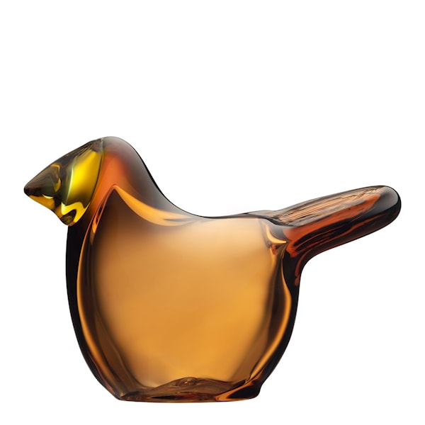 Varje fågel är munblåst av skickliga glasblåsare vid Iittalas glasbruk i Finland, vilket gör varje exemplar helt unikt – ingen fågel är den andra lik. Den karakteristiska formen, det runda huvudet och den upphöjda näbben fångar rörelsen hos den lilla fågeln mitt i flykten, medan färgskiftningarna i glaset – här i citron och koppar – ger liv och personlighet åt varje detalj.