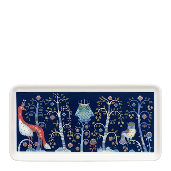 Taika tallrik rektangel 12x24 cm från Iittala är både en praktisk serveringsdel och ett vackert prydnadsföremål. Tallriken förenar Klaus Haapaniemis fascinerande illustrationer med Heikki Orvolas avskalade former, vilket skapar en unik och iögonfallande design. Den mångsidiga tallriken kan också användas som ett elegant förvaringsföremål för små skatter. Med sin kombination av funktion och estetik är denna tallrik en utmärkt presentidé för alla som uppskattar vacker och användbar design.