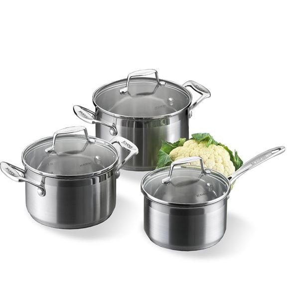 Impact grytset från Scanpan är ett komplett startset till ditt kök! Med en liten kastrull, basgryta och större gryta får du allt du behöver för en lyckad matlagning. Utmärkt att ge bort som gåva till bröllopsparet eller den nyinflyttade. Glaslock till alla kärl medföljer.