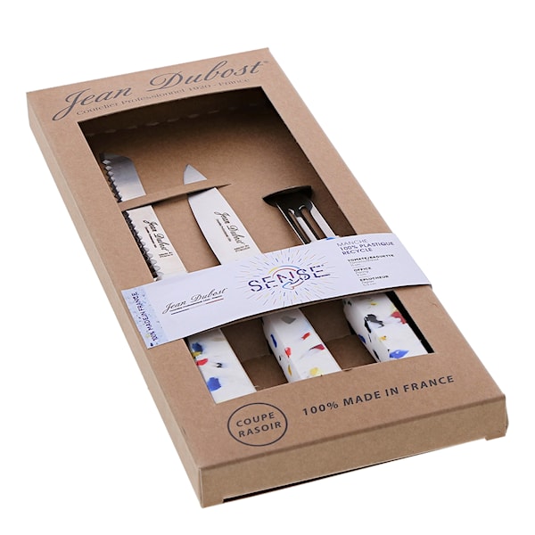 Detta miljövänliga knivset i 3 delar från Jean Dubost innehåller allt det lilla köket behöver i köksväg för att gå som på räls! I setet ingår en mindre skalkniv som kan användas för diverse köksarbeten, en mindre tandad brödkniv samt en skalare. Samtliga knivar har metalldelar i högkvalitativt rostfritt stål med förstklassig hållbarhet, samt färgglada handtag, knivarna miljövänligt framtagna och handtagen är helt tillverkade i återvunnen plast. En perfekt present till den miljömedvetna studenten!
