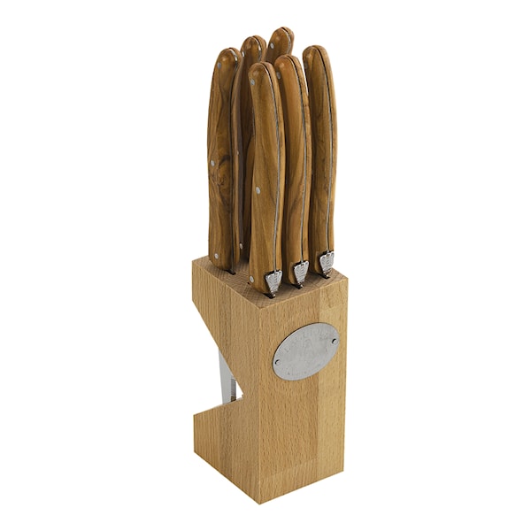 Knivset med 6 stekknivar med handtag i olivträ och medföljande knivblock i bokträ från franska Jean Dubost Laguiole.