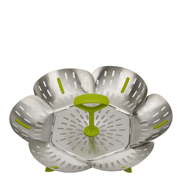Denna rymliga ångkorg i rostfritt stål är utrustad med självjusterande sidor, värmetåliga silikonfötter och fenor för optimal funktionalitet.