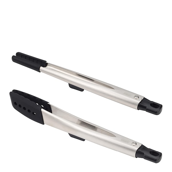 Elevate Fusion tång 2-pack från Joseph Joseph är ett set med två mångsidiga tänger som möter dina behov i köket. De två tängerna har olika spetsar: en med precisionsspets som är idealisk för att hantera känsliga livsmedel som fisk och grönsaker, och en med större spetsar som passar perfekt för att greppa större matvaror som kött och stekar. Båda tängerna har låsbara armar i rostfritt stål och integrerade redskapsstöd som håller spetsarna uppe från bänkskivan, vilket förbättrar hygienen och minskar spill under matlagningen.