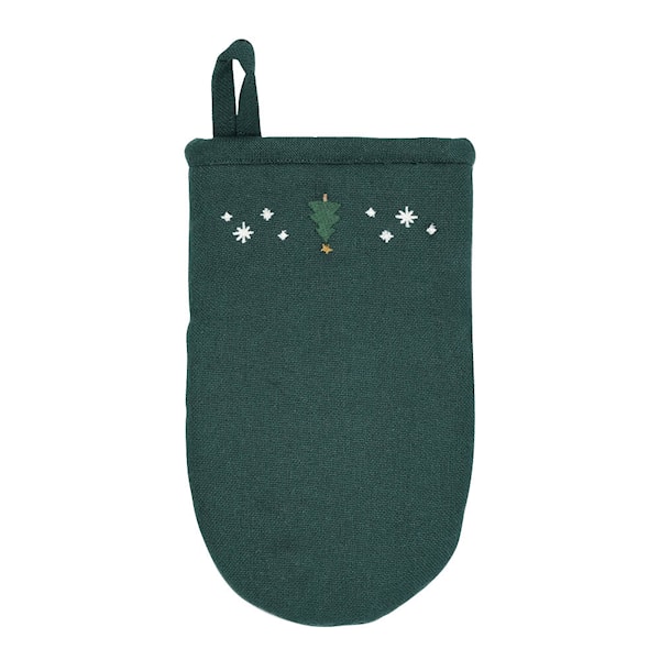 Christmas Fable ugnsvante från Juna för julstämningen hela vägen in i köket. Den djupgröna färgen och det broderade motivet av seriens julgran, omgiven av små vita stjärnor, ger ett dekorativt och genomtänkt uttryck – perfekt för adventshelger, julbak och festmiddagar. Broderiet är placerat längst ned på vanten, så att de fina detaljerna syns även vid användning.