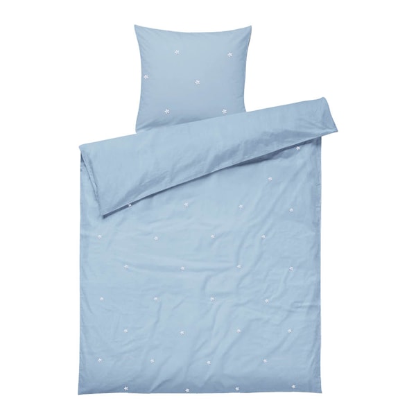 Juna Daisy junior påslakanset till barn 100x140 cm i ljusblått ger barnrummet ett friskt och rogivande uttryck. De små broderade blommorna i vitt står i vacker kontrast mot den ljusblå bakgrunden och kombinerar klassisk design med en modern ton.