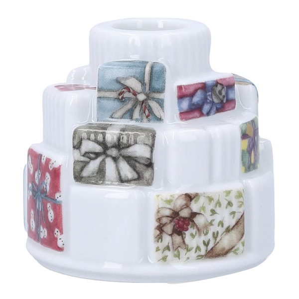 Ljusstaken Hammershøi Christmas från Kähler är 7,5 cm hög och prydd med en vacker stapel av presenter. På toppen finns plats för ett kronljus – perfekt för att skapa julstämning på middagsbordet eller i fönstret.