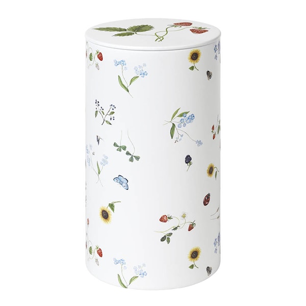 Kähler Hammershøi Summer förvaringsburk är en hyllning till det danska sommarens ljus, färger och former. Med en höjd på 18,5 cm är denna dekorativa burk, tillverkad i metall och dekorerad med en symfoni av somriga motiv, både funktionell och estetisk. Perfekt för förvaring av småkakor eller andra sommarfavoriter, passar den lika bra som en del av dukningen på terrassen som en vacker detalj på kökshyllan.