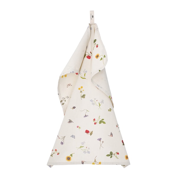 Hammershøi Summer kökshandduk i storleken 50x70 cm tillför köket en somrig och ljus känsla. Motivet består av handmålade illustrationer av konstnären Rikke Jacobsen, där sommarbär, solrosor, förgätmigej och fladdrande fjärilar samspelar i en harmonisk komposition. Illustrationerna är gjorda som akvareller och har överförts till textilen med en lätt och naturlig finish.