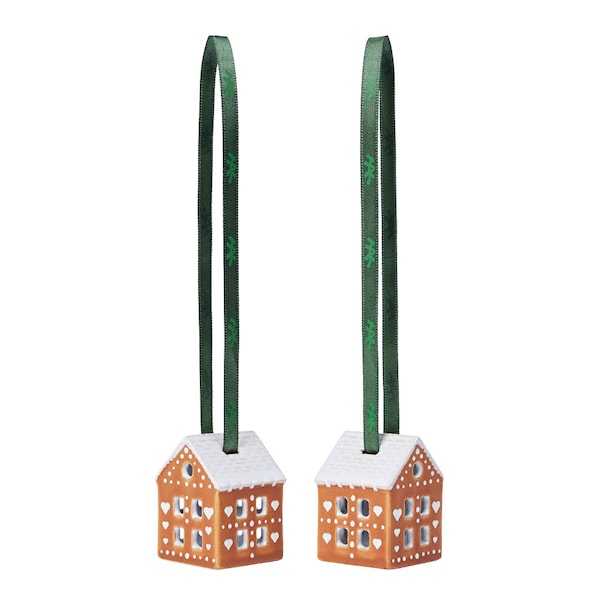 Gingerbread julhänge i 2-pack från Kähler är julpynt som är formade som små pepparkakshus i brunt stengods, dekorerade med vita detaljer och präglade HAK-initialer. Varje hänge mäter 5x4 cm och levereras i 2-pack med grönt band.