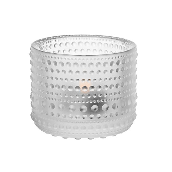 Iittala Kastehelmi ljuslykta 6,4 cm är en designikon skapad av Oiva Toikka år 1964, vars namn betyder ”daggdroppe” på svenska. Toikka hämtade sin inspiration från den finska naturen – från morgondaggens små, glittrande pärlor som samlas på grässtrån i gryningen. Det unika mönstret med sina små glaspärlor fångar ljuset på ett magiskt sätt och skapar ett varmt och levande sken när lyktan tänds.