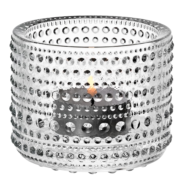 Iittala Kastehelmi ljuslykta 6,4 cm är en designikon skapad av Oiva Toikka år 1964, vars namn betyder ”daggdroppe” på svenska. Toikka hämtade sin inspiration från den finska naturen – från morgondaggens små, glittrande pärlor som samlas på grässtrån i gryningen. Det unika mönstret med sina små glaspärlor fångar ljuset på ett magiskt sätt och skapar ett varmt och levande sken när lyktan tänds.