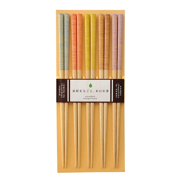 Fem par ätpinnar från japanska Kawai. Pinnarna har penslat mönster i jordnära lugna färger. Kan diskas i maskin.
