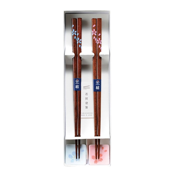 Kawai gåvoset med två par ätpinnar och eleganta pinnhållare dekorerade med japanska blomsterkransar. En harmonisk kombination av funktion och estetik som gör dukningen mer inbjudande. Varje set är tillverkat i Japan med fokus på kvalitet och detaljer, och tål maskindisk för praktisk skötsel.