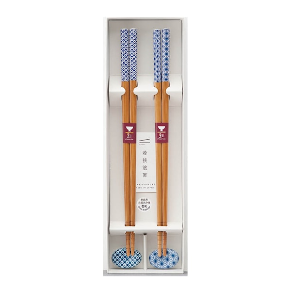 Kawai gåvoset med två par ätpinnar och eleganta pinnhållare dekorerade med klassiska japanska grafiska mönster. En balanserad kombination av funktion och estetik som gör serveringen mer inbjudande. Setet är tillverkat i Japan med känsla för detaljer och kvalitet, och tål maskindisk för praktisk skötsel.