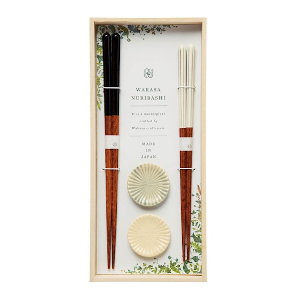 Gåvoset från Kawai med två par ätpinnar dekorerade i svart och vitt, tillsammans med eleganta pinnstöd i porslin. Setet kommer i en fin trälåda – perfekt som present med japansk känsla.
