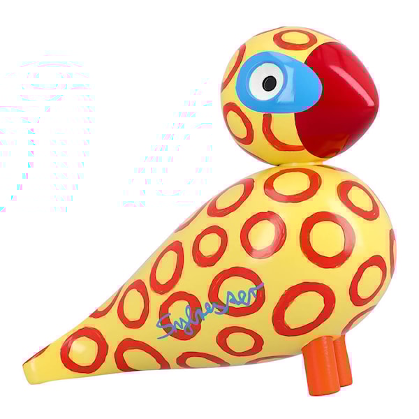 Fågeln är 15,5 cm hög och noggrant tillverkad i FSC®-certifierat bokträ, där varje penseldrag gör den unik. Den handmålade dekoren och konstnärens signatur ger fågeln ett exklusivt värde som gör den till mer än bara ett dekorationsföremål – den är ett uttryck för dansk designhistoria och skaparglädje, ett objekt som lever och berikar sin omgivning med färg och form.