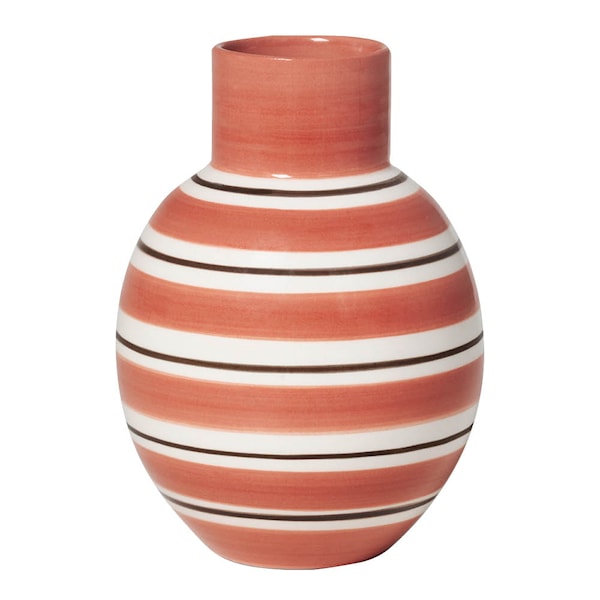 Vaserna i Omaggio Nuovo är tillverkade i keramik och handmålade med dekorativa ränder i glasyr, inspirerade av äldre arkivmaterial från Kählers historia. De nya färgerna och penseldragen ger varje vas ett unikt uttryck, där nyanser och linjer tillför liv och djup. Formen har förfinats med subtila justeringar, men behåller samtidigt den karaktäristiska siluetten som förknippas med Kählers design.