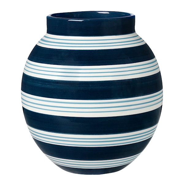 Vaserna i Omaggio Nuovo är tillverkade i keramik och handmålade med dekorativa ränder i glasyr, inspirerade av äldre arkivmaterial från Kählers historia. De nya färgerna och penseldragen ger varje vas ett unikt uttryck, där nyanser och linjer tillför liv och djup. Formen har förfinats med subtila justeringar, men behåller samtidigt den karaktäristiska siluetten som förknippas med Kählers design.
