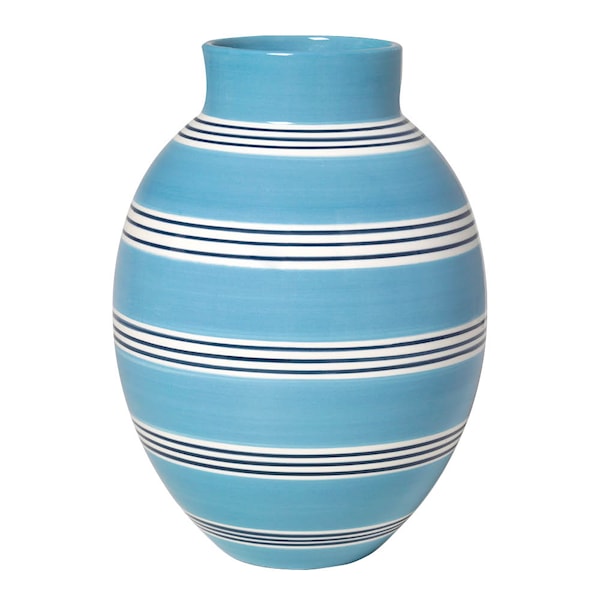 Vaserna i Omaggio Nuovo är tillverkade i keramik och handmålade med dekorativa ränder i glasyr, inspirerade av äldre arkivmaterial från Kählers historia. De nya färgerna och penseldragen ger varje vas ett unikt uttryck, där nyanser och linjer tillför liv och djup. Formen har förfinats med subtila justeringar, men behåller samtidigt den karaktäristiska siluetten som förknippas med Kählers design.