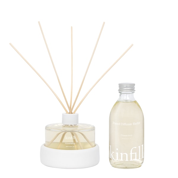 Startkit Reed Diffuser 250 ml Flowershop från Kinfill är genomtänkt designad för att fylla alla rum med raffinerade dofter. Denna säkra formel, tillverkad i Nederländerna, är inrymd i en unik hållare av glas och keramik tillverkad i Portugal. Doften har en blandning av exploderande blommor, nyklippta stjälkar, färska grönsaker och krossade majsblad, vilket skapar en frisk och livlig atmosfär.