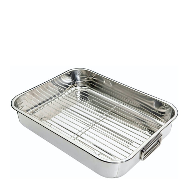Blue Card långpanna med galler 43x31 cm i stål från KitchenCraft är perfekt för middagsbjudningar och högtider. Denna extra stora stekpanna har plats för stora köttstycken eller en julkalkon och säkerställer att allt tillagas jämnt och saftigt. Det medföljande gallret lyfter köttet så att safter och oljor samlas i botten, vilket ger extra saftiga resultat och gör det enkelt att göra sås av de insamlade saften.