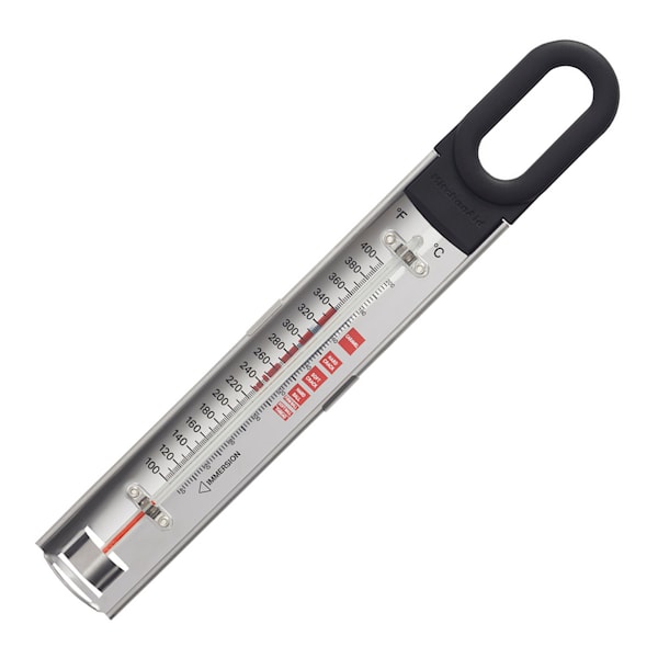 Core Clip On-termometer för socker/fritering 31,3 cm från KitchenAid är det perfekta verktyget för att göra sötsaker eller övervaka oljetemperaturen vid fritering. Termometern är tillverkad av robust rostfritt stål och har en böjd kropp som enkelt kan klämmas fast på kanten av kastrullen, vilket gör att du kan röra om utan hinder och uppnå optimal värmefördelning för konsekventa resultat.