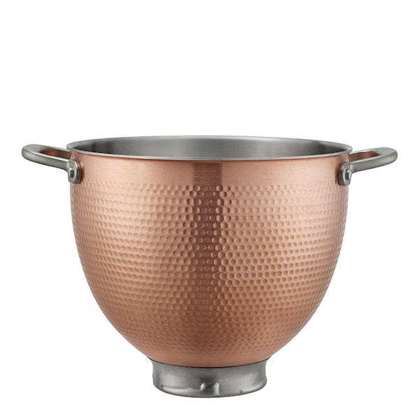 En 4,7 liters kopparskål från KitchenAid med handtag i klassisk kastrullstil och en naturligt organisk yta som utvecklar en mörkare patina över tiden. Den är säker att använda med livsmedel då insidan är av rostfritt stål.