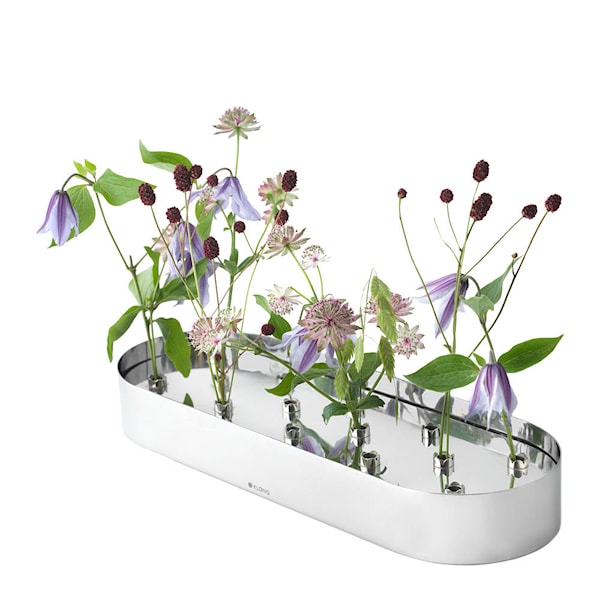 Vasen Jubel från Klong är tillverkad i rostfritt stål med en matt pulverlackerad mörkgrön finish och har en vändbar stålinsats med små pipor som låter varje blomma stå för sig själv. För de festligare tillfällena kan man addera den medföljande skylten med texten ”Hurray”- perfekt för alla speciella tillfällen.