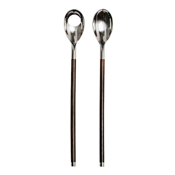 Salladsbesticken Salvia, designade av Jonas Bohlin för Klong, enkelt eleganta i rostfritt stål med handtag av mörkt trä, finns i både matt och blank utförande och kommer i en fin presentförpackning.
