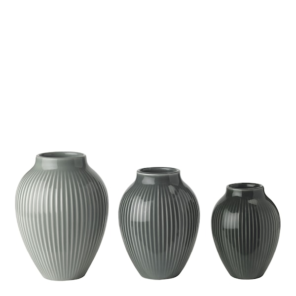 Ripple mini-vaser från Knabstrup Keramik i 3 olika matta grönfärger – Misty green, Celadon green och Dark green – är ett dekorativt 3-pack med rötter i 40-talets formspråk.