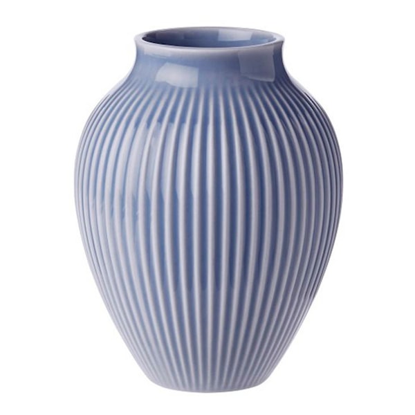 Den karakteristiska räfflade ytan ger denna Knabstrup Keramik vas ett levande och skulpturalt uttryck som gör den lika vacker med en enkel blomma som helt utan innehåll. Storleken gör den idealisk för små minibuketter, kvistar eller som en dekorativ detalj på hyllor, bord eller fönsterbrädor.