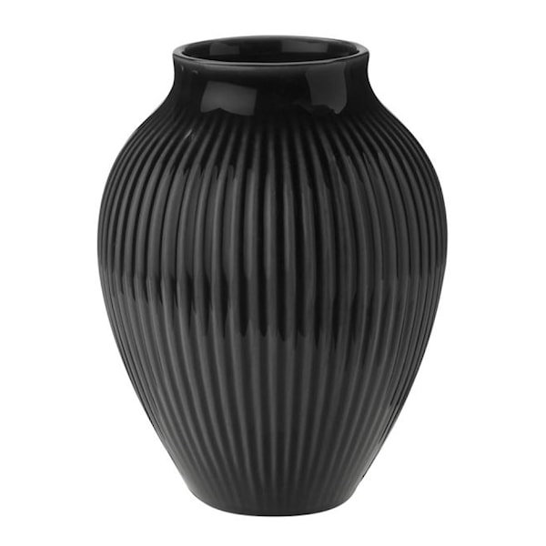 Den karakteristiska räfflade ytan ger denna Knabstrup Keramik vas ett levande och skulpturalt uttryck som gör den lika vacker med en enkel blomma som helt utan innehåll. Storleken gör den idealisk för små minibuketter, kvistar eller som en dekorativ detalj på hyllor, bord eller fönsterbrädor.