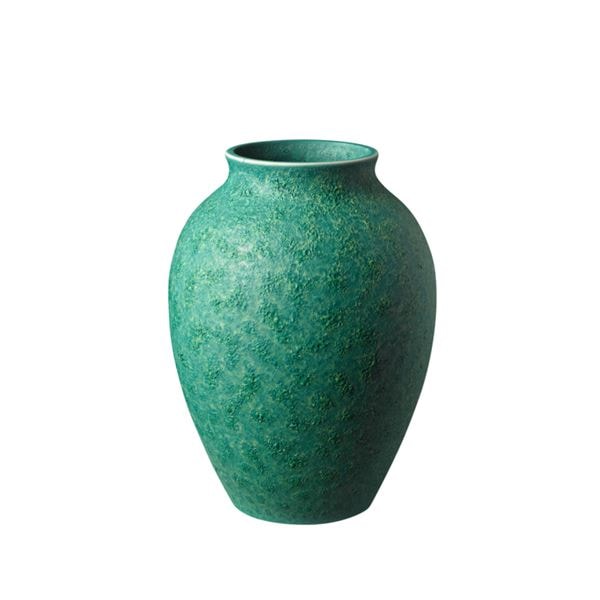 Denna minivas är tillverkad i stengods och glaserad i en vacker turkos nyans med levande struktur, fångar vasen ljuset på ett subtilt sätt och ger ett naturligt och lugnt uttryck. Den rundade formen framhäver små blommor eller kvistar. Den är också fin att matcha med fler små eller någon större Knabstrup-vas, och den är lika vacker med blommor som som en dekorativ detalj på egen hand.