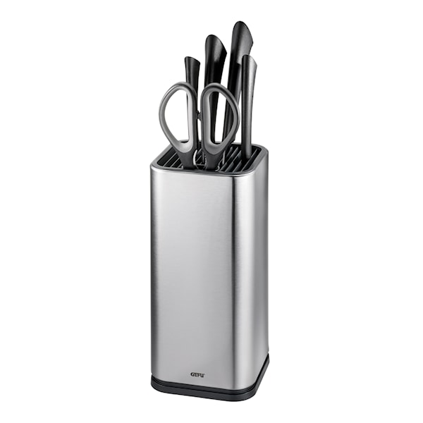 Knivblock i rostfritt stål från Gefu är en elegant och stilrent knivblock som passar perfekt in i ditt modernt kök. Knivblocket har plats för upp till fem knivar och har även ett smart lås som förhindrar att knivarna glider ut ur blocket.