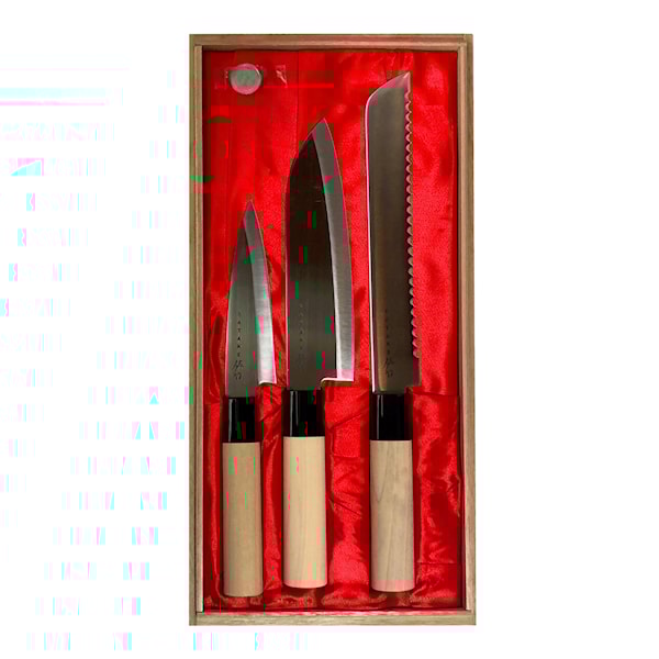 Exklusivt knivset med 3 knivar i en vacker förvaringsbox. I träboxen ligger även en japansk Yen som enligt tradition ska återlämnas till den man får knivarna av eftersom det enligt tradition betyder otur att ge bort knivar annars.