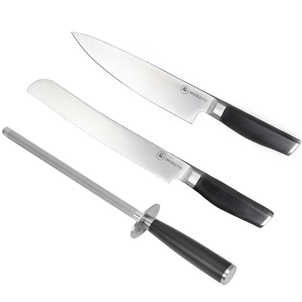Detta knivset innehåller tre oumbärliga redskap i köket: en kockkniv på 20 cm, en brödkniv och ett slipstål. Kockkniven är mångsidig och passar för det mesta – från att skära grönsaker till att hantera benfritt kött och fisk. Brödkniven har ett tandat blad som skär rent genom både hårda skorpor och nybakat bröd. Slipstålet håller knivarna vassa och redo, och är enkelt att använda för att snabbt återställa eggens skärpa.