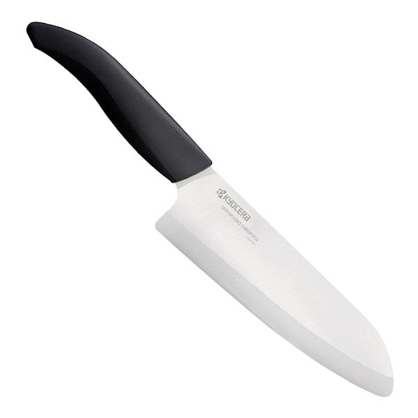 Keramisk kockkniv 16 cm från Kyocera, en mycket bra allroundkniv för matlagningen. Kniven är rakbladsvass och håller skärpan tack vare att keramik är mycket hårdare än stål. Bara diamant är hårdare. Men när den behöver skärpas går det enkelt med ett diamantbryne. Knivbladet väger bara hälften så mycket som ett metallblad och rostar inte eller påverkas av syror.